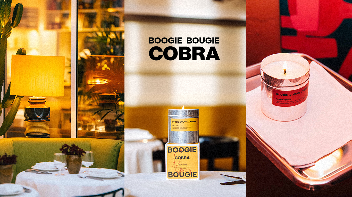 Cobra — the Antwerp dining experience known for its eclectic energy, warm edge, and late-night rhythm — joins Boogie Bougie for a two-scent candle collection shaped by the pulse of its spaces.